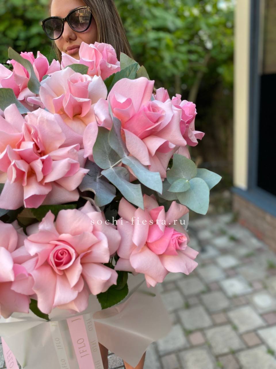 Семнадцать вывернутых роз открывают фактурную глубину лепестков и создают объемную композицию. Каждый бутон раскрывается по-своему, а эвкалипт добавляет воздушности общей форме.