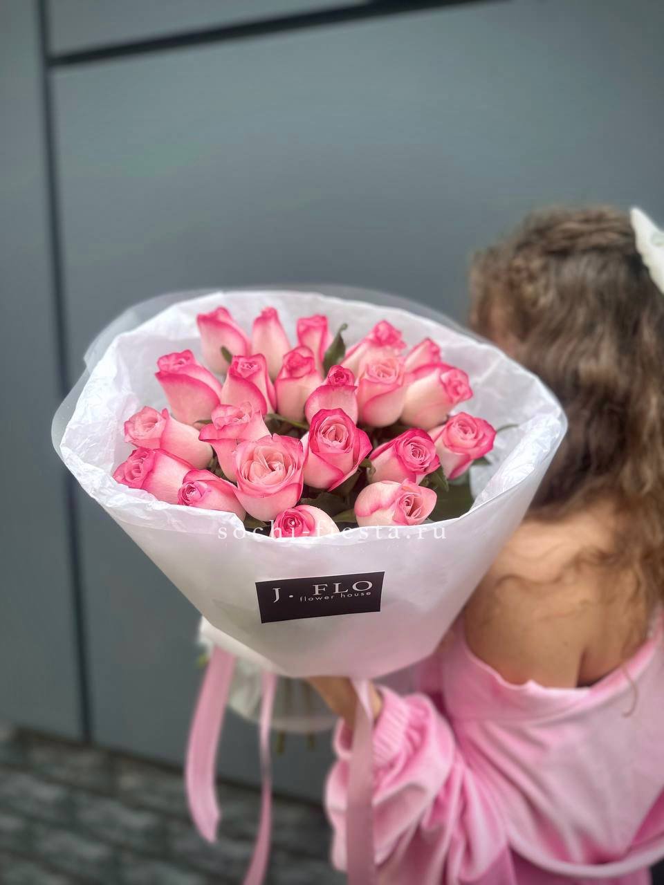 21 розовые розы, лента, дизайнерское оформление.