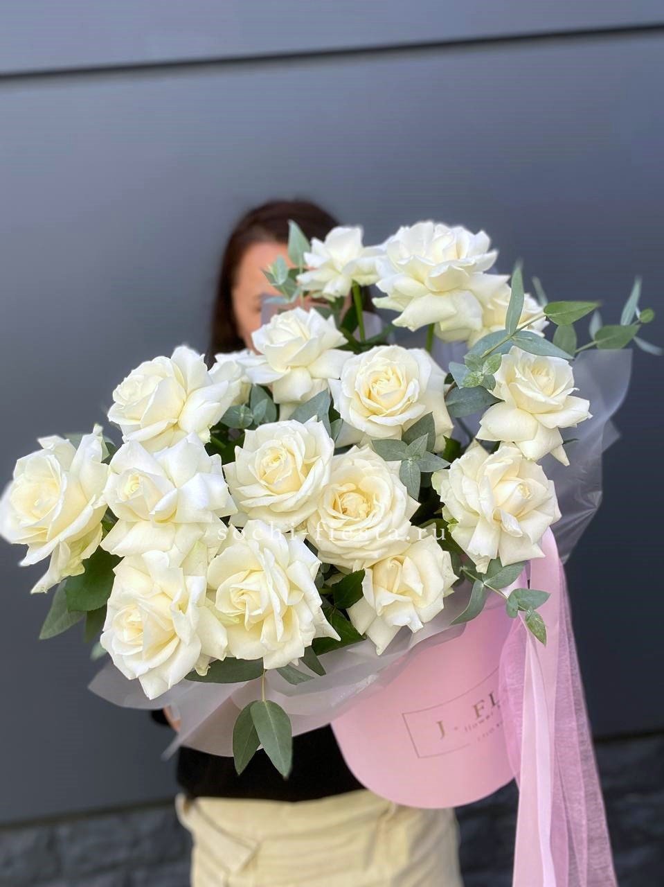 Тринадцать вывернутых французских роз сочетаются с серебристым эвкалиптом. Белые головки с волнистыми лепестками образуют воздушное облако.