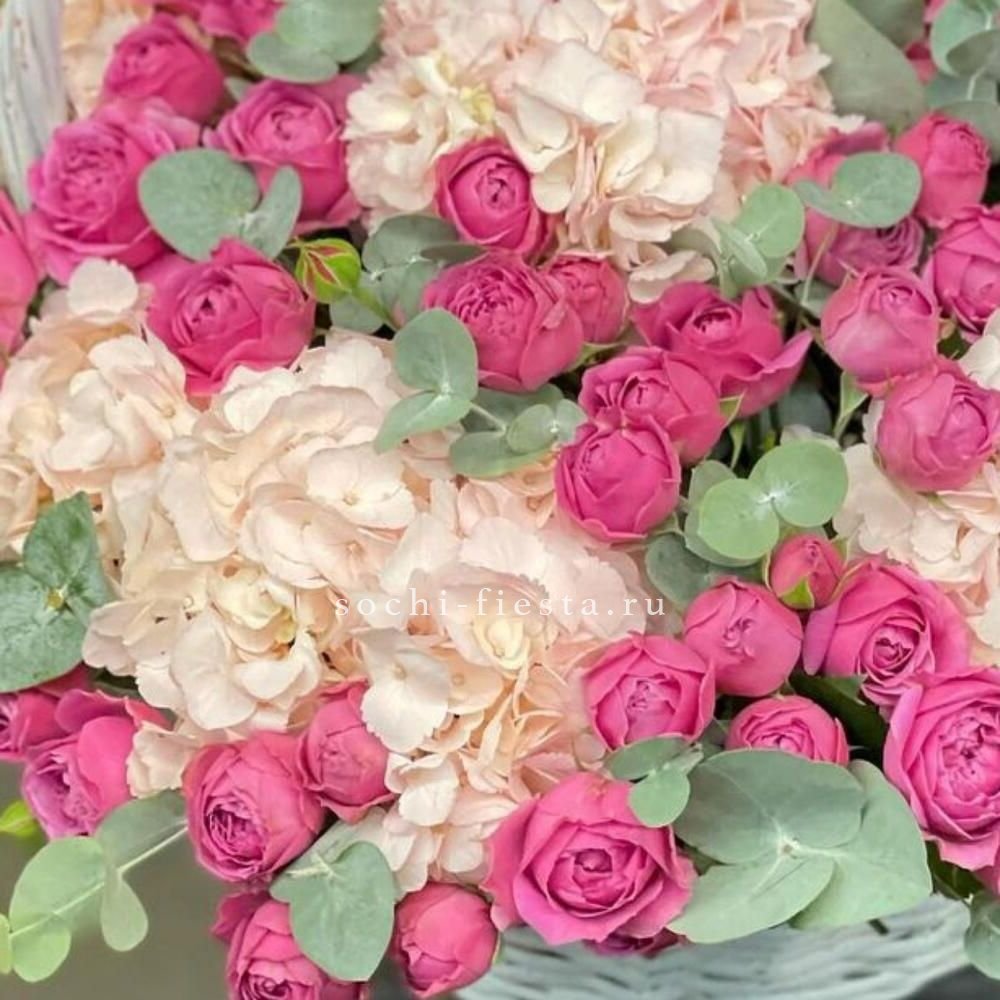 Семь пышных кустовых роз собраны в плотный круг и обрамлены воздушными ветками хамелациума. Бутоны раскрыты почти полностью, создавая объёмную шапку с мягкими переходами оттенков. Композиция держит форму и выглядит самодостаточно.