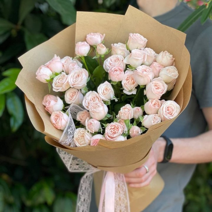 Кустовые пионовидные розы сорта «Бомбастик» отличаются крупным бутонов, нежной текстурой и бледным воздушным оттенком.