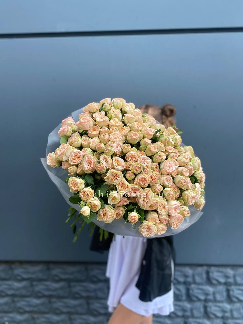кустовая пионовидная роза, лента, дизайнерская упаковка.