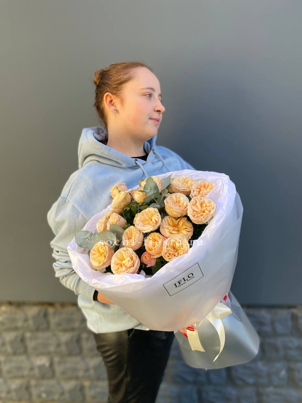 Семь кустовых роз с ветками эвкалипта создают лёгкую композицию, где зелень обрамляет каждый бутон и добавляет воздуха между цветами. Простая сборка с естественным ритмом и свежим характером.