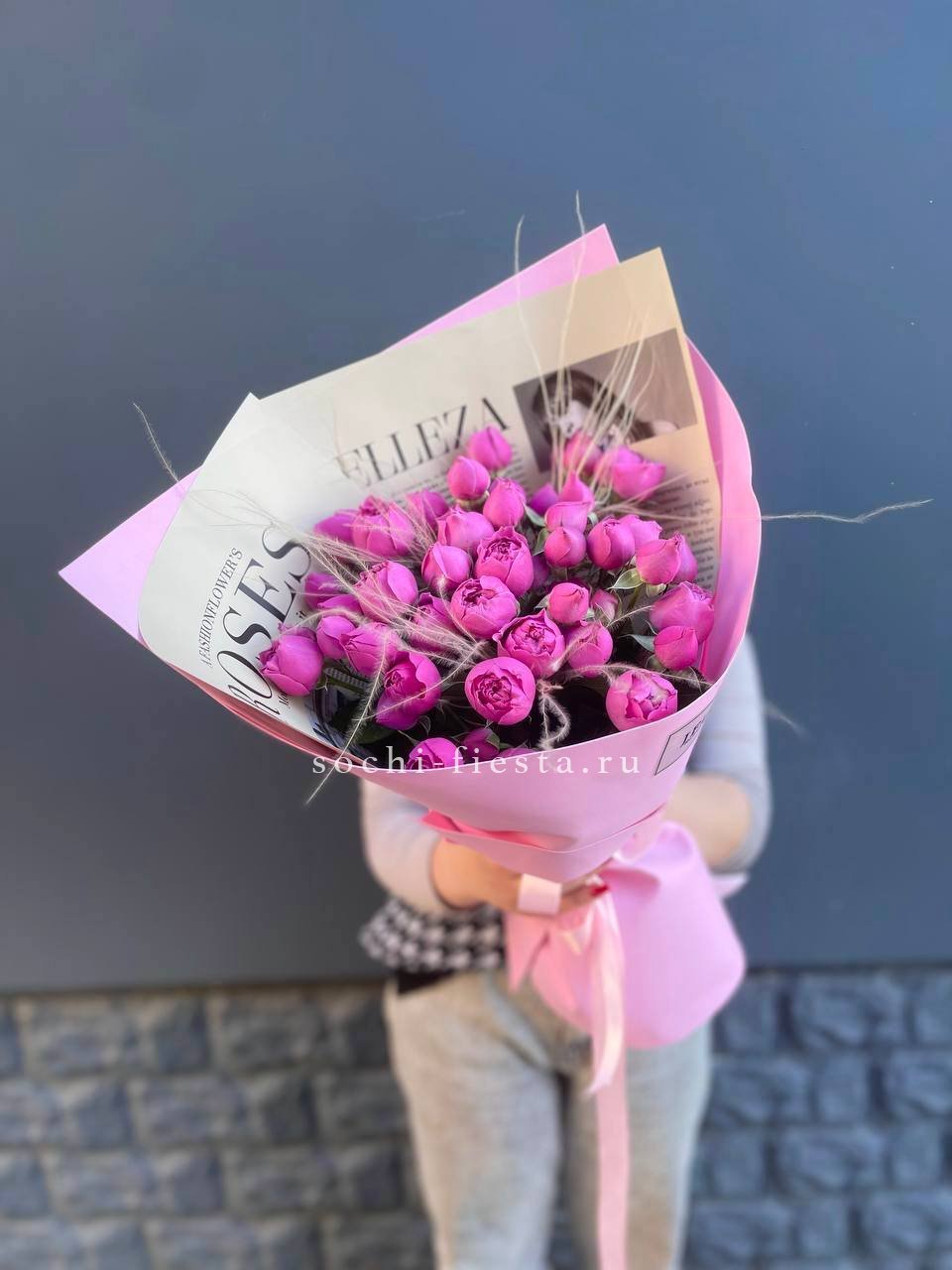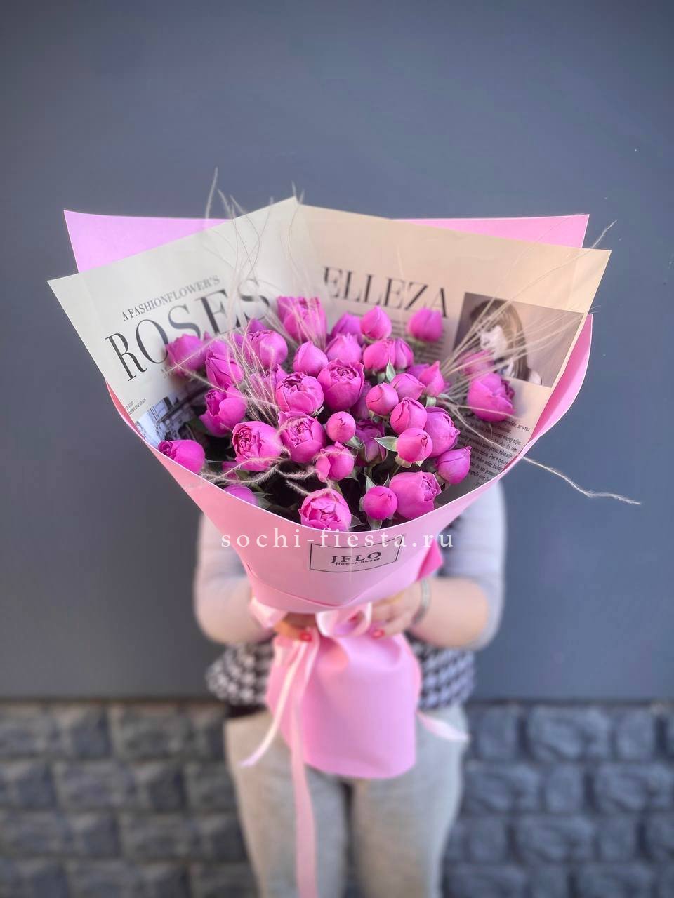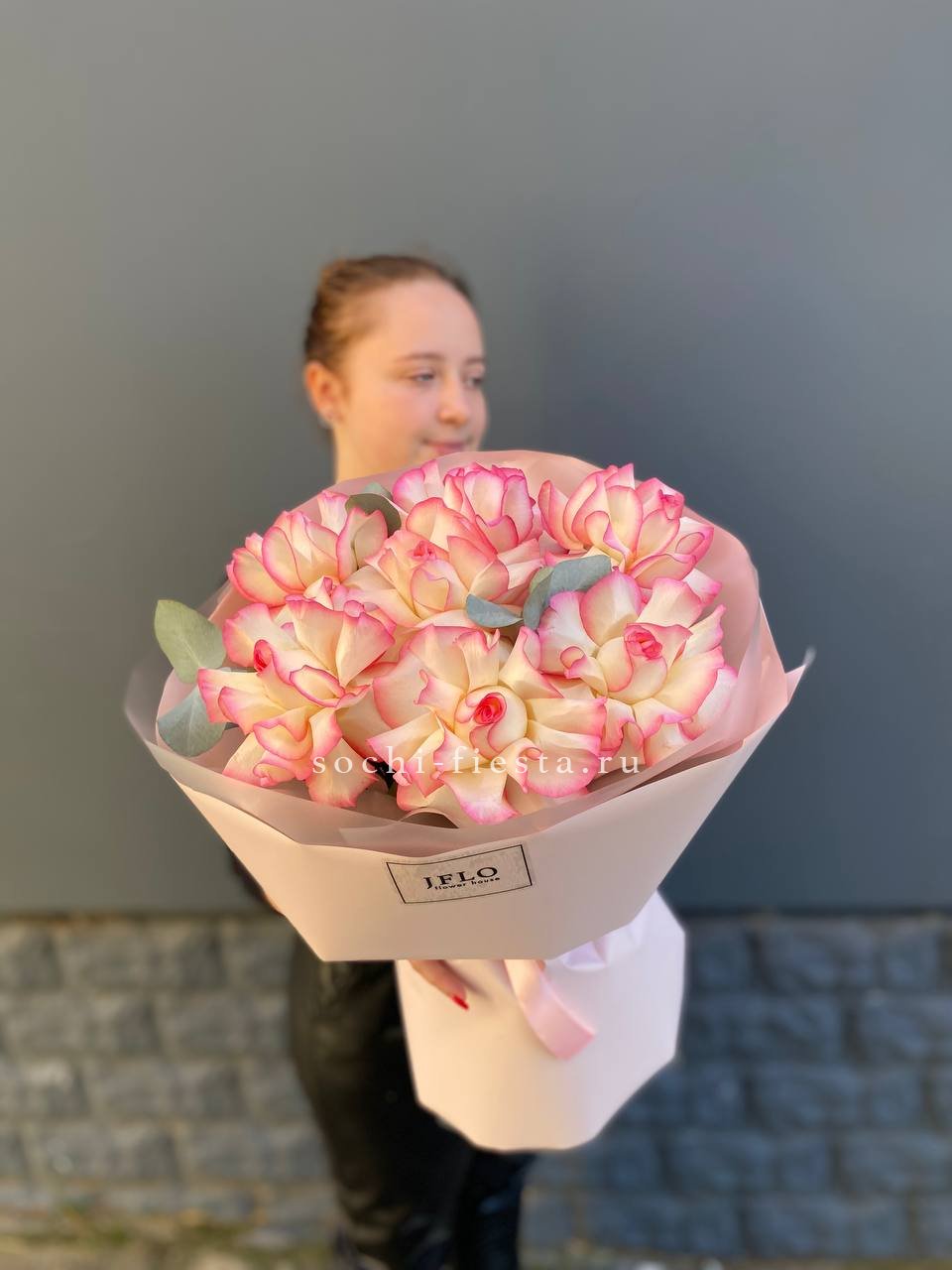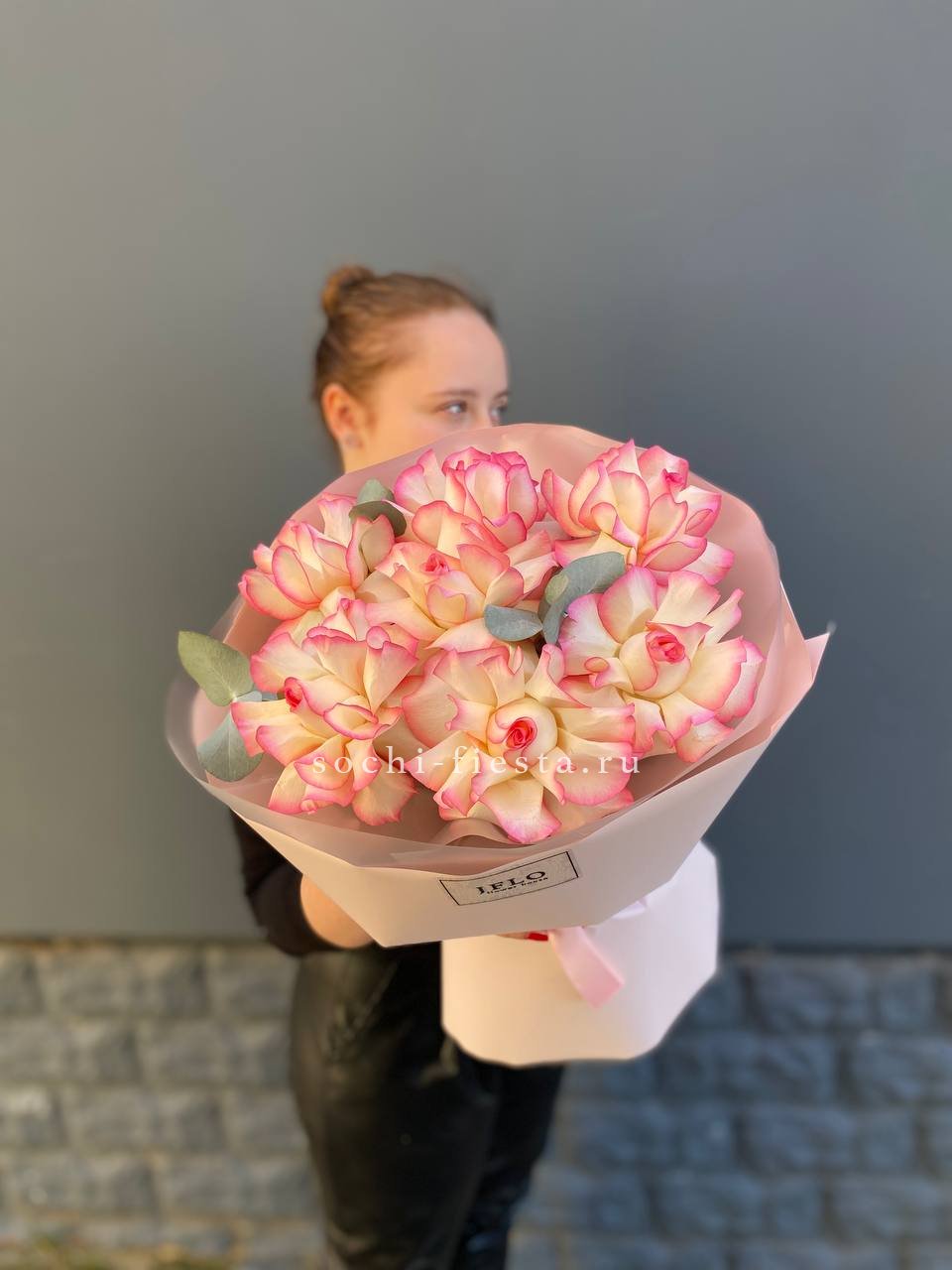розы пионовидные 21шт, эвкалипт, пленка, лента.