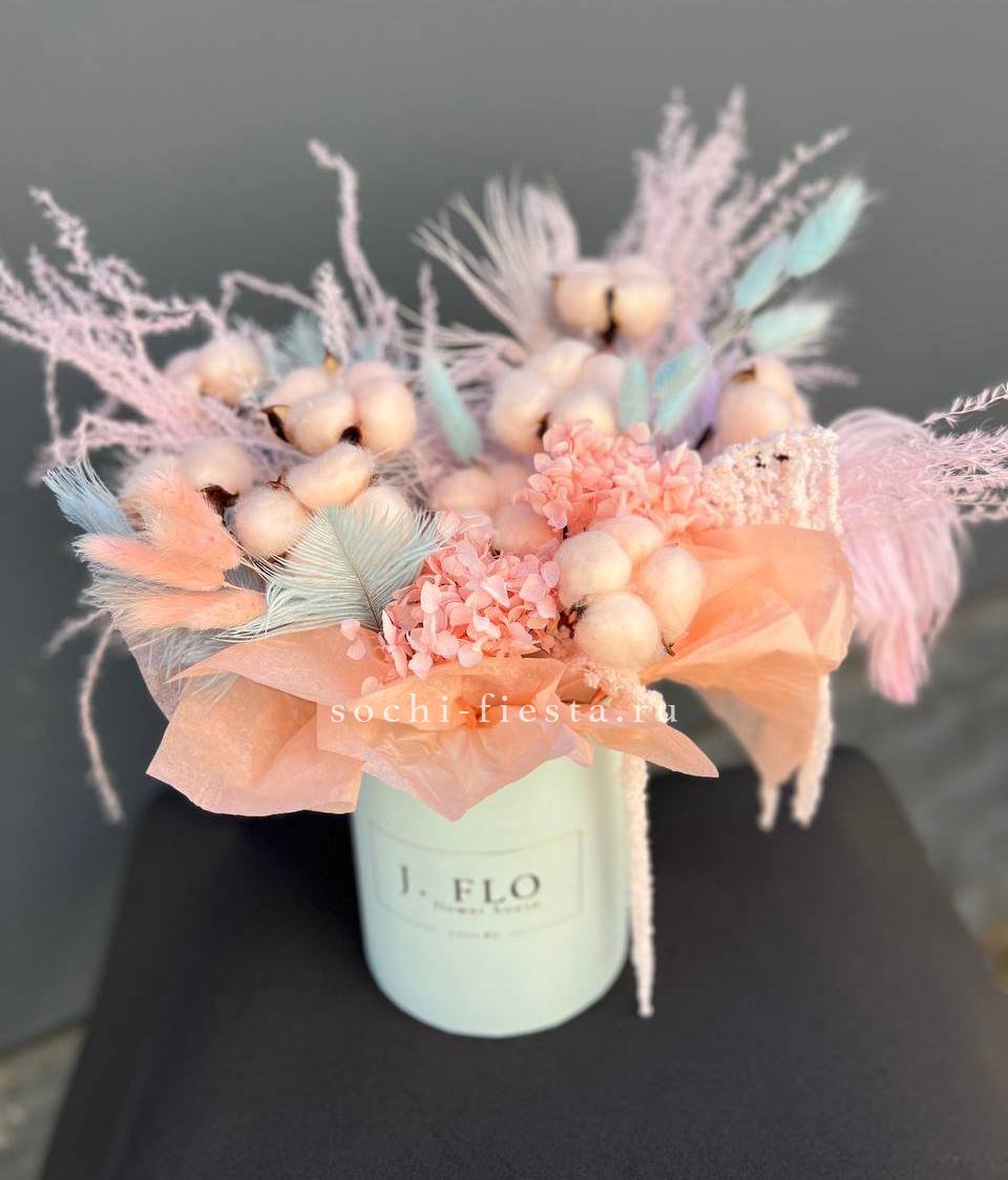 Композиция в цилиндре с лагурусом, хлопком и амарантом создает впечатление природной гармонии. Перья вносят легкость. Удобна в размещении и долго сохраняет первоначальный вид.