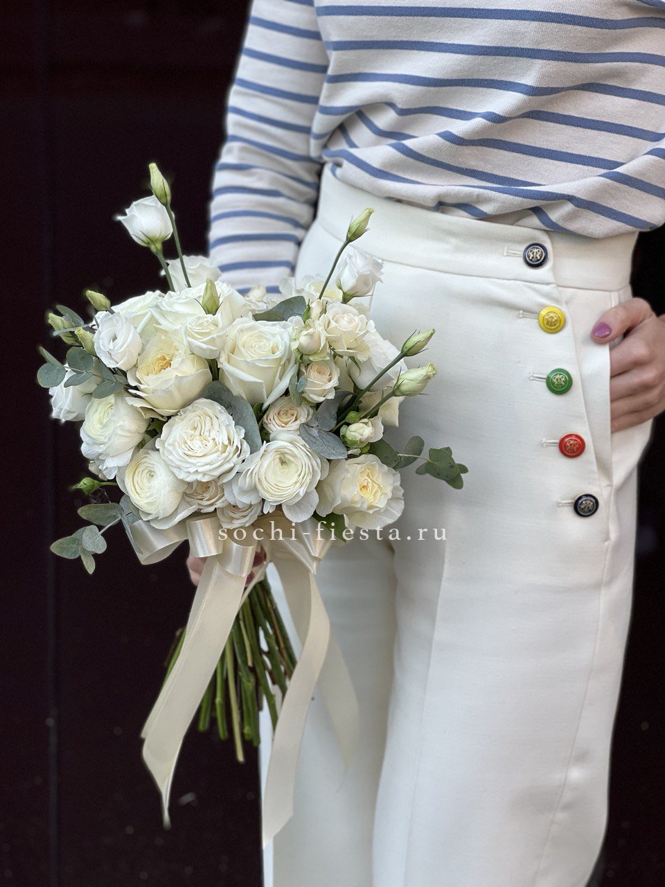 кустовые пионовидные розы Бомбастик, одноголовая пионовидная роза (или замена вне сезона на кустовую пионовидную), диантусы, эвкалипт, лента.